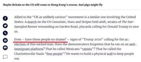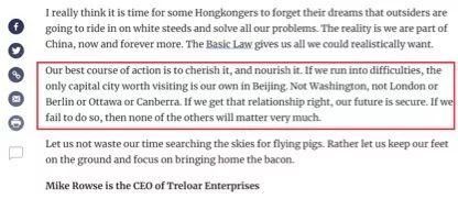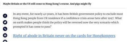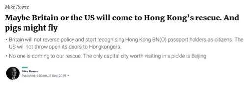 昨天,他在香港的《南华早报》上撰写了一篇讽刺这些极端分子的文章,标题是“或许英国和美国会来救香港,就如猪也可能会飞一样”。