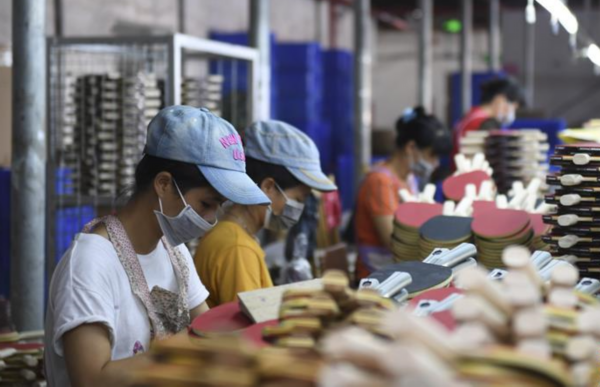 图为,工人在广西兴业县一家“就业扶贫车间”内加工乒乓球拍。图片来源,新华网。