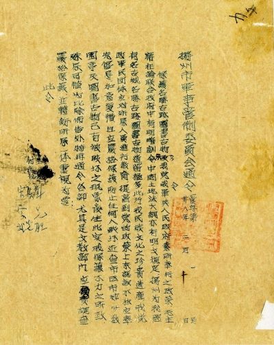 市档案馆专家告诉记者,这份通令是扬州最早关于古城保护的历史文献。通令明确了扬州古城是优秀民族文化遗产的认识,并表达了政府致力于保护名胜古迹和图书古物的决心和态度,表明了扬州历来就有保护古物的意识和风气。紧随这份通令之后,1951年10月,成立了苏北文物管理委员会。1954年9月,扬州市市级文物管理委员会成立,专责保护文物。1955年,扬州在全省率先制定了城市总体规划,明确了老城区、瘦西湖风景区、文教区、工业区等功能分工。这为扬州城市建设布局打下了重要基础,对历史文化古城的保护起到了关键作用。