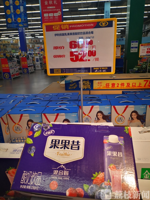 在麦德龙超市,一款果果昔酸奶标注原价为60元一提,促销价为52元一提。不过,标识牌上并未看到促销期限。检查人员表示,按照规定,促销的期限必须在醒目位置公示,此外,这款产品如果标注有原价,就意味着这款商品必须有以原价售出的销售记录。在检查过程中,商家却无法提供。