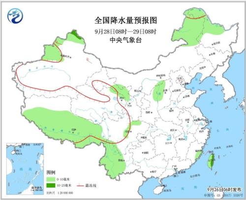 9月28日8时至29日8时,内蒙古东北部、黑龙江北部、山西西北部、陕西东北部、甘肃中部、四川盆地西部、云南中西部、新疆西北部、西藏中南部和台湾岛等地有小雨,其中,新疆北疆北部和台湾岛东部局地中雨。新疆北有4~5级风。台湾海峡将有4~6级、阵风7级的东北风。