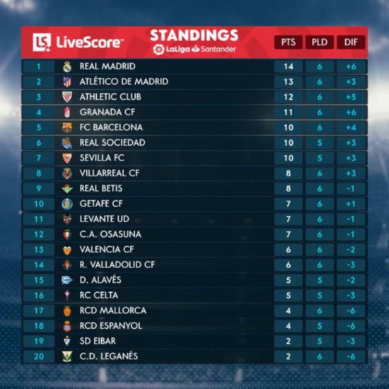 腾讯体育9月26日讯 今日凌晨,西甲第6轮结束前7场赛事,皇马巴萨马竞均获胜,毕尔巴鄂战平,瓦伦西亚痛失好局。皇马马竞排名头两位,下轮马德里德比将上演榜首大战,27年头一回。