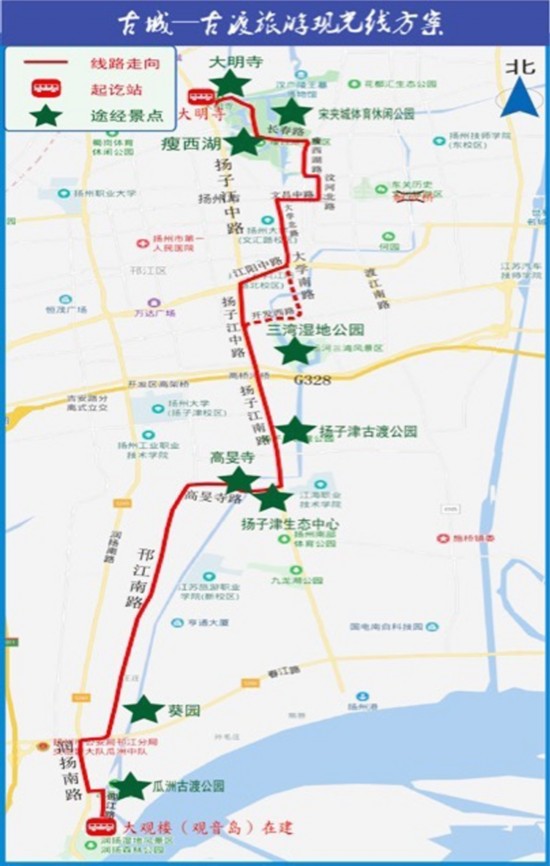 为配合瓜洲镇大运河文化带龙头工程建设,今起,从大明寺至瓜洲古渡公园的旅游2号线正式开通。这条公交线路全长26.8公里,沿线串联起10多个景点,是名副其实的旅游公交线路。