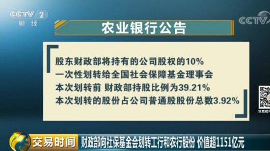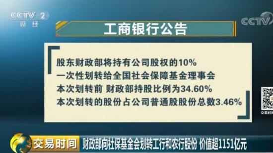 中国农业银行和工商银行在昨天晚间发布公告称,两家公司都收到通知,股东财政部将其持有的公司股权的10%一次性划转给全国社会保障基金理事会持有。