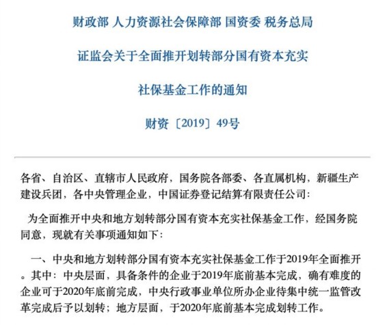 这份文件中提出,中央和地方划转部分国有资本充实社保基金工作于2019年全面推开。其中:中央层面,具备条件的企业于2019年底前基本完成,确有难度的企业可于2020年底前完成,中央行政事业单位所办企业待集中统一监管改革完成后予以划转;地方层面,于2020年底前基本完成划转工作。