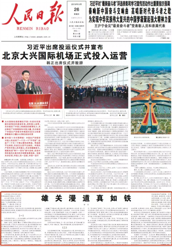 《人民日报》2019年9月26日头版刊登“宣言”文章《雄关漫道真如铁》