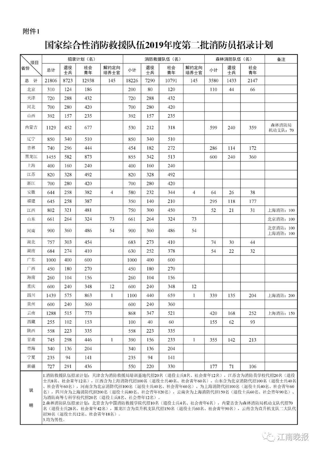 经应急管理部、人力资源社会保障部批准,此次国家综合性消防救援队伍共招录消防员21806名,均为男性,其中:定向招录退役士兵8723名、公开招录社会青年12938名、专项招录原公安消防部队解约定向培养士官145名。