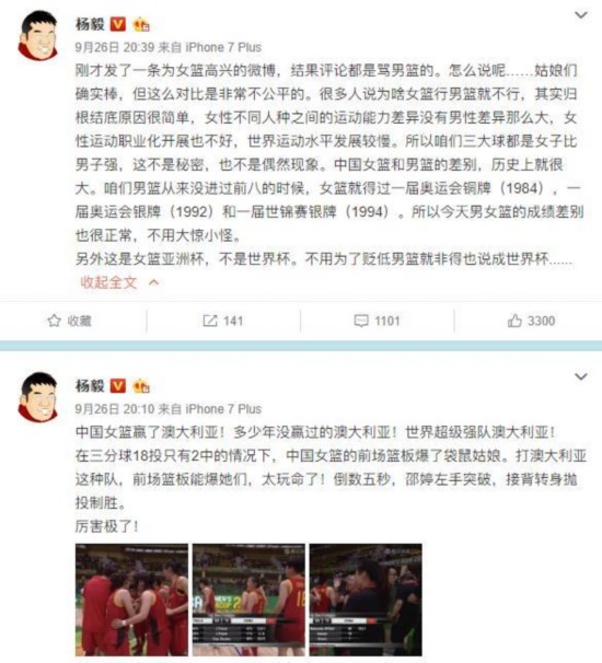 对此,杨毅则再度发布了一条微博,认为球迷单以成绩将男女篮进行对比是非常不公平的,“刚才发布了一条为女篮高兴的微博,结果评论都是骂男篮的。怎么说呢……姑娘们确实棒,但这么对比是非常不公平的。很多人说为啥女篮行男篮就不行,其实归根结底原因很简单,女性不同人种之间的运动能力差异没有男性差异那么大,女性运动职业化开展也不好,世界运动水平发展较慢。所以咱们三大球都是女子比男子强,这不是秘密,也不是偶然现象。中国女篮和男篮的差别,历史上就很大。咱们男篮从来没进过前八的时候,女篮就得过一届奥运会铜牌(1984),一届奥运会银牌(1992)和一届世锦赛银牌(1994)。所以今天男女篮的成绩差别也很正常,不用大惊小怪。另外,这是女篮亚洲杯,不是世界杯。不用为了贬低男篮就非得也说成世界杯……”