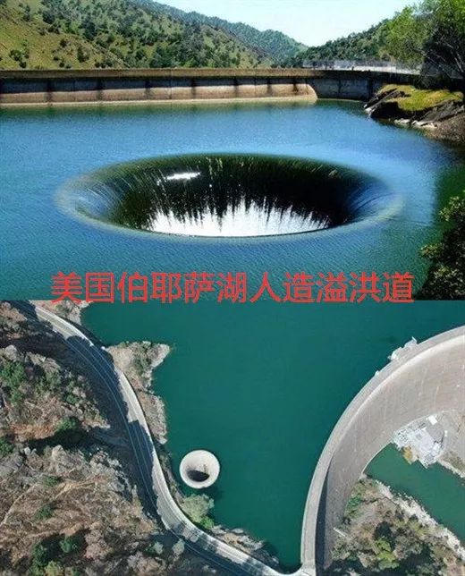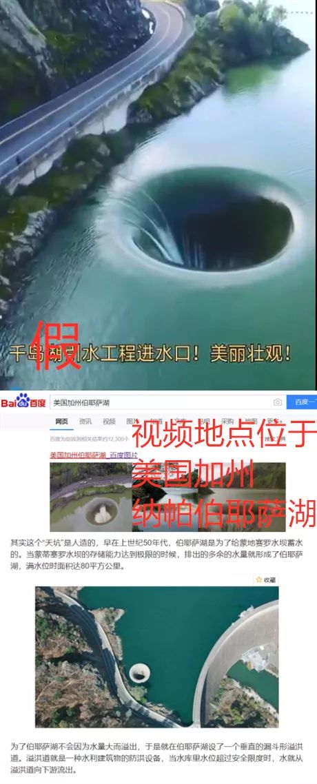 该画面不属于千岛湖,真实地点位于美国加州纳帕伯耶萨湖人工湖,该处其实是一个人造溢洪道,当地人称它为“光荣洞”。这个洞为缓解当地常年干旱做出巨大贡献,其作用就像下水道口,能把湖里超出水平线的水,通过管道排放出去,然后流往干旱地区。