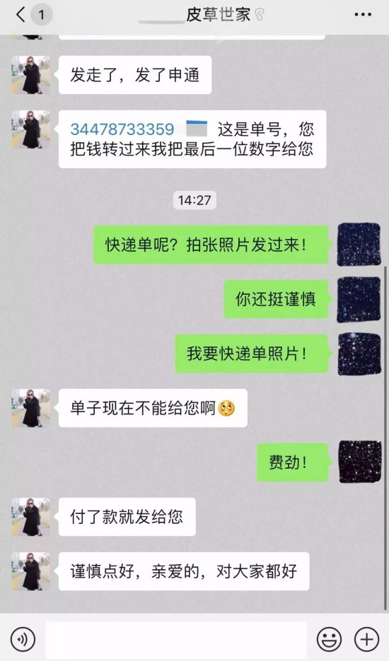 没见到货就要付钱,这风险有点大,于是陆某提出,让对方先把皮草寄出,有了快递单号以后再付款。不久,陆某就收到了对方发货的单号。这下应该没问题了,放松了警惕的陆某向对方微信转账1200元。
