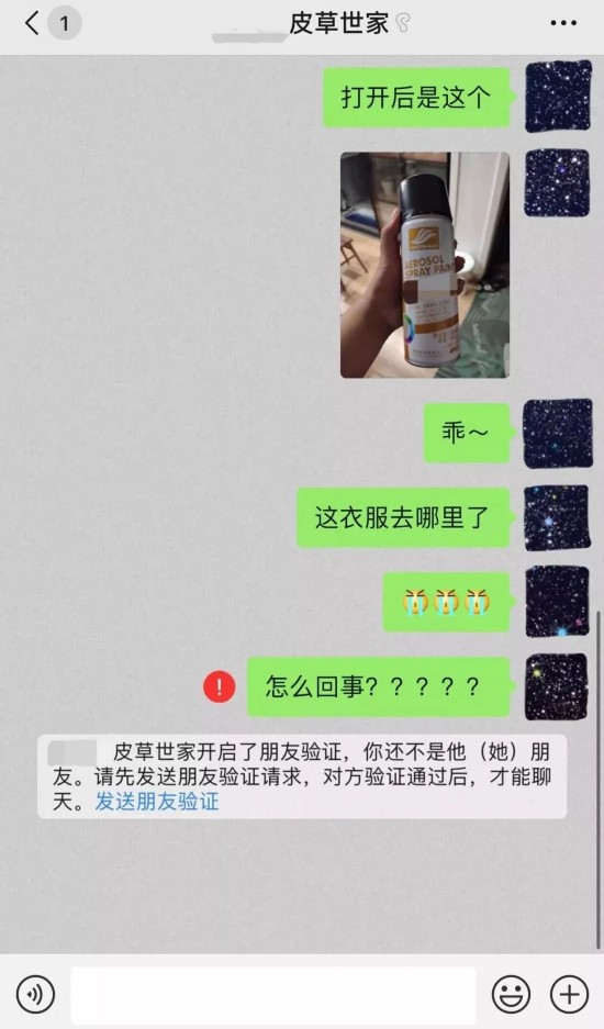 几天后,陆某心心念念的皮草终于到货了,可当她满怀期待地打开包装一看,里面只有一瓶自喷漆……难道是寄错了?当陆某试图通过微信和对方确认时,发现消息已经发不出去了——她也被拉黑了!