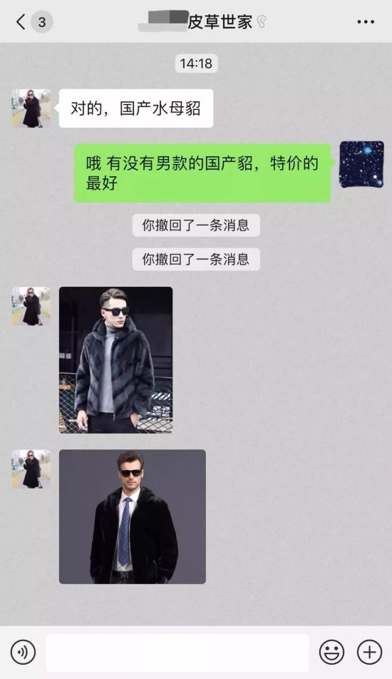 同样是通过微信添加为好友,陆女士看中了“XX皮草世家”的一件白色皮草,一番讨价还价后,最终以1200元的价格成交。