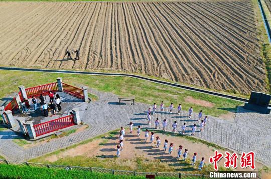 9月27日下午,来自瑞金市小学的小学生摆成“70”字样,在红井景区朗诵小学语文课本中的文章《吃水不忘挖井人》。 刘占昆 摄