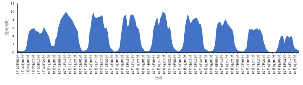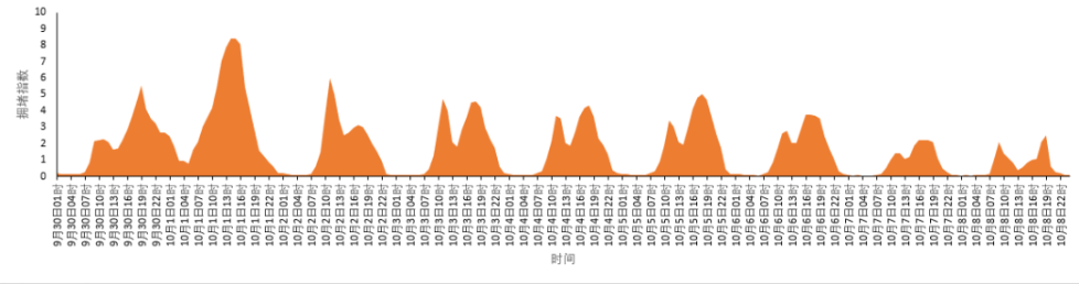 10月5日至7日,受短途出行及分散返程因素影响,返程高峰拥堵程度明显低于10月1日,但仍高于日常平均水平。10月8日全国公路网拥堵程度迅速回落至平日正常水平。