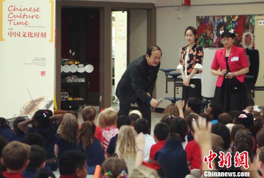 图为9月27日,美国休斯敦柯尔特小学举行一场题为“中国文化时刻”的讲座。来自中国驻休斯敦总领馆文化组组长郑文与学生们互动交流。 曾静宁 摄