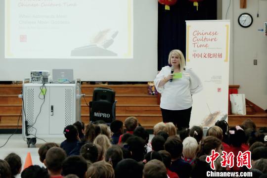 图为9月27日,美国休斯敦柯尔特小学举行一场题为“中国文化时刻”的讲座。副校长凯瑟琳?克罗塞特向学生们介绍来自中国驻休斯敦总领馆的演讲人。 曾静宁 摄