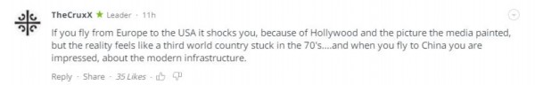 “当你从欧洲飞往美国,会感到震惊,与好莱坞电影所描绘的场景不同,事实上,那里看起来像上个世纪70年代,当你飞往中国,你会因为现代的基建感到印象深刻。”