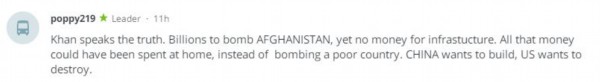 “钱都花在阿富汗上,所以没钱搞基建。这些钱本可以花在国内,而不是轰炸一个贫穷的国家。中国想要建设,美国却想要摧毁。”