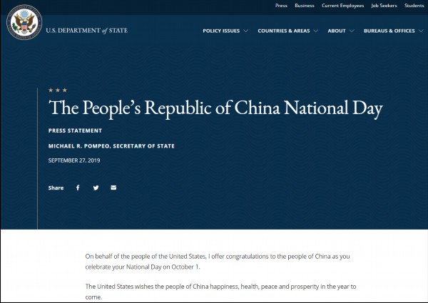 去年9月27日,蓬佩奥曾在国务院网站祝福中国人民国庆节“假日愉快”。