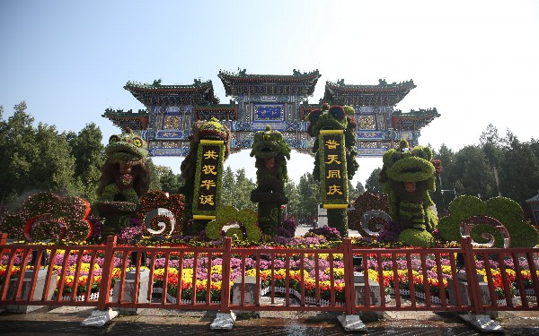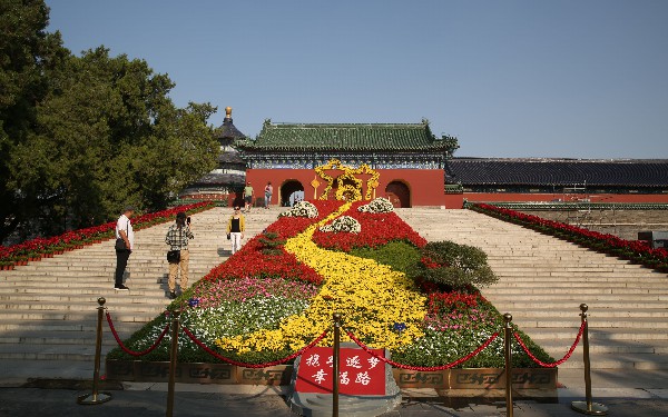 国庆期间,漫步在纵贯天坛公园南北,由立体花堆点缀的大道上,欣赏着“普天同庆逢盛世”市花月季菊花联展,天坛公园的景色美不胜收。