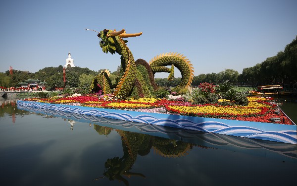 北海公园南门荷花湖的“龙腾盛世”主题花坛。北京市国庆游园指挥部 供图