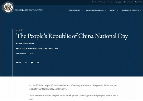 话说回来,美国政府官方也向中国送来了国庆祝福。