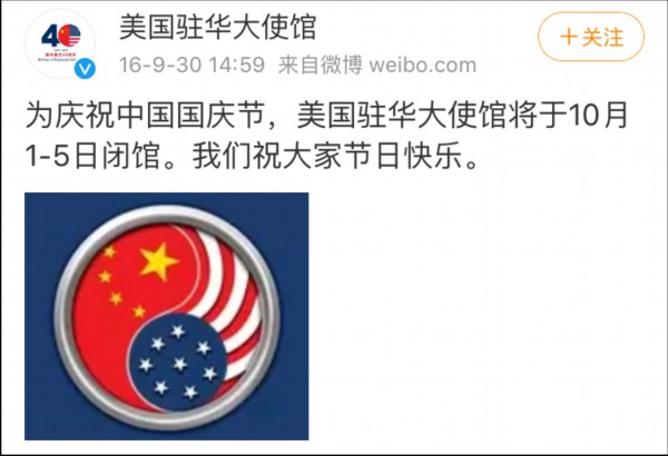 今天(9月28日),美国驻华大使馆通过官方微信公众号宣布,他们将于9月30日到10月3日闭馆,理由是“为庆祝中国国庆节”。