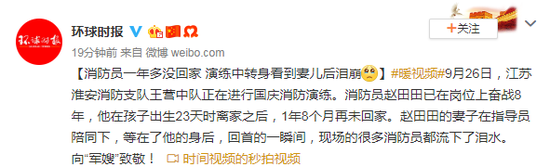 9月26日,江苏淮安消防支队王营中队正在进行国庆消防演练。消防员赵田田已在岗位上奋战8年,他在孩子出生23天时离家之后,1年8个月再未回家。赵田田的妻子在指导员陪同下,等在了他的身后,回首的一瞬间,现场的很多消防员都流下了泪水。向“军嫂”致敬!