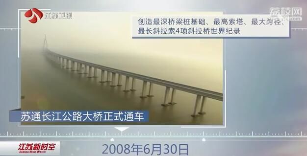 2008年6月30日,苏通长江公路大桥正式通车,创造最深桥梁桩基础、最高索塔、最大跨径、最长斜拉索4项斜拉桥世界纪录。