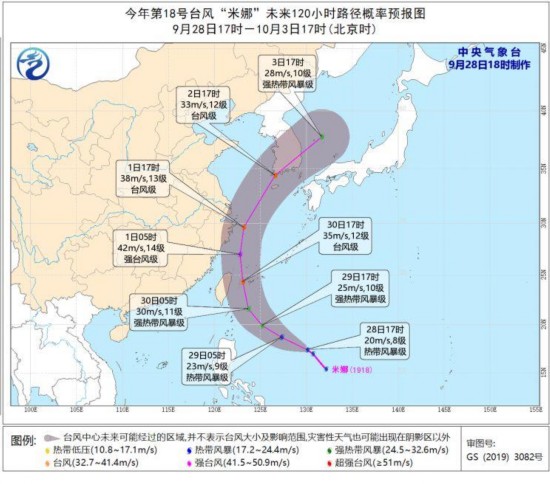 中新网9月28日电 据中央气象台网站消息,今年第18号台风“米娜”(热带风暴级)已于28日上午8点钟生成,预计将于30日傍晚前后移入东海南部,最强可达台风级或强台风级。受其影响,9月30日至10月2日,东海、黄海南部和华东沿海将有较大风雨。