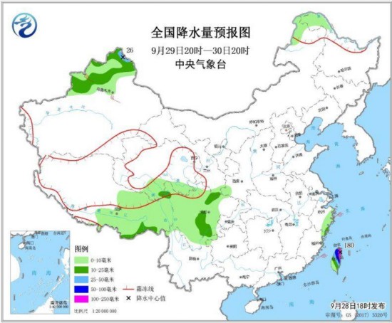 9月29日20时至30日20时,新疆伊犁河谷、北疆北部、西藏东南部、四川盆地西部、台湾岛大部等地的部分地区有中到大雨,台湾岛中东部的部分地区有暴雨或大暴雨(100~180毫米)。新疆沿天山地区和伊犁河谷等地的部分地区有5~7级风。东海南部海域、台湾以东洋面、巴士海峡将有7~9级、阵风10~11级的大风,台湾以东洋面部分海域风力可达11~12级、阵风13级。