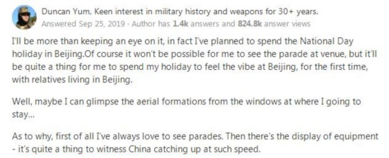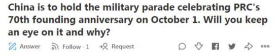在有着美版“知乎”之称的Quora上,也有不少外国网友讨论中国国庆阅兵。海外网注意到一篇题为“为庆祝10月1日新中国成立70周年,中国将举行阅兵活动,你们会关注吗?为什么?”的帖子。