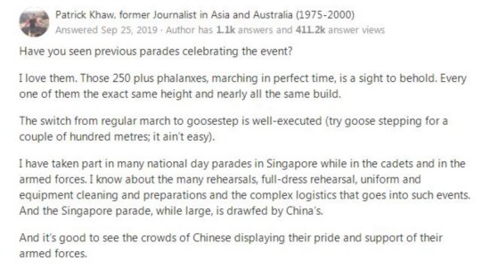 身为一名退休的老记者,外国网友帕特里克(Patrick Khaw)说,“你们看过先前的阅兵吗?我爱它们。方队在完美的时间中行进,是一道风景,每个人的身高完全相同,身材也几乎相同。从常规步伐到正步切换得很好(尝试正步走几百米,这并不容易)。”