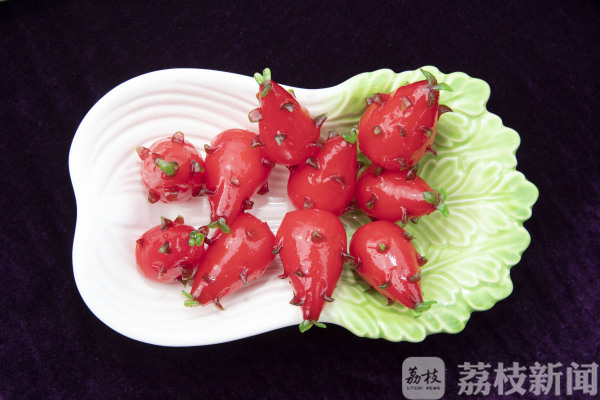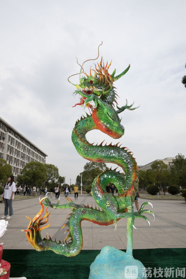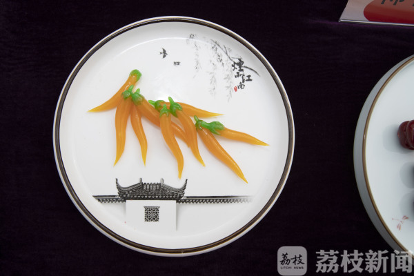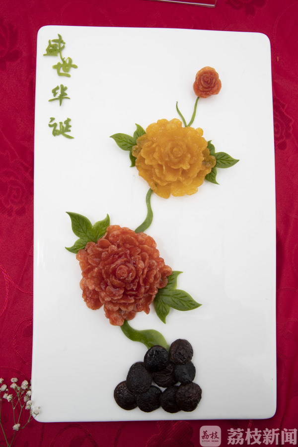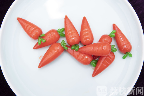 学生们自个儿的作品也是争妍斗艳。菊花豆腐、紫薯丝、蓑衣黄瓜、荷塘月色、毛笔酥、豆渣点心、甜品糕点、各式船点等等,层出不穷,现场食客无不交口称赞。