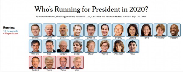 截至9月20日,美国两党2020总统参选人名单 《纽约时报》截图