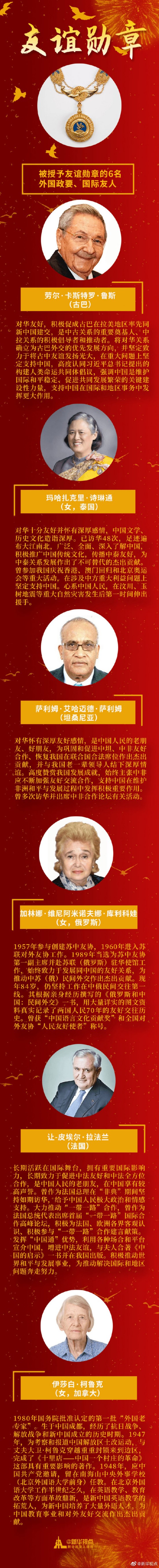 劳尔·卡斯特罗·鲁斯、玛哈扎克里·诗琳通等6人被授予“友谊勋章”。他们与中国结下不解情缘,留下一段段佳话。为他们点赞!