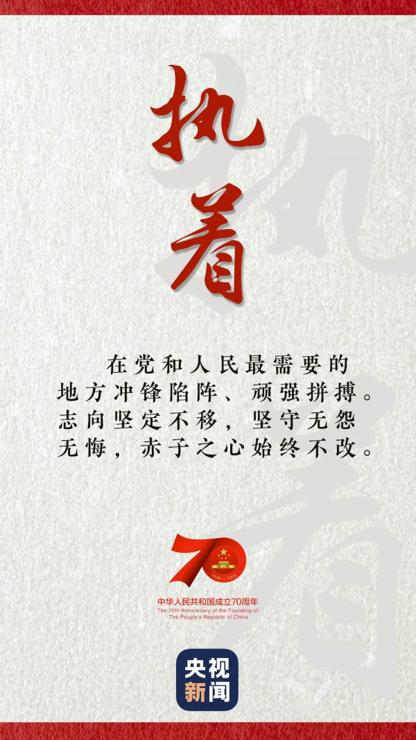 ——执着,就是英雄模范们都在党和人民最需要的地方冲锋陷阵、顽强拼搏,几十年如一日埋头苦干,为国为民奉献的志向坚定不移,对事业的坚守无怨无悔,为民族复兴拼搏奋斗的赤子之心始终不改。