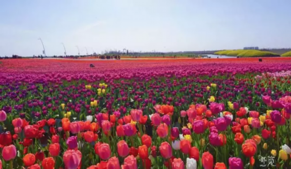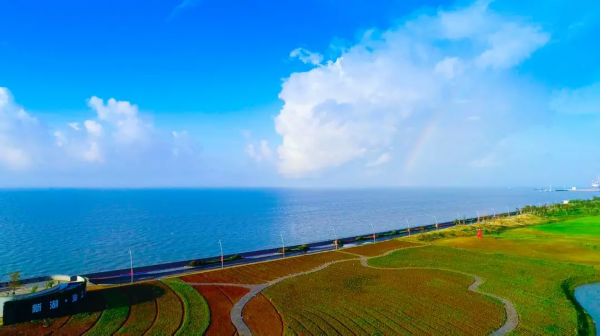 到长江、黄海、东海三水交汇处,一面是三水浪漫的邂逅,一面是芳香四溢的七彩花田。