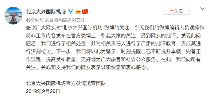感谢广大网友对“北京大兴国际机场”微博的关注。今天我们的微博编辑人员误操作将非工作内容发布在官方微博上,引起大家的关注,受到网友的批评。发现此问题后,我们进行了相关处置,并对相关责任人进行了严肃的批评教育,责成其进行深刻检讨。下一步,我们将以此为警示,时刻提醒自己不断提升本领,完善工作流程,提高发布质量,更好地为广大旅客和社会公众服务。在此,我们向所有关注、关心和支持我们的网友表示诚挚歉意和衷心感谢。
