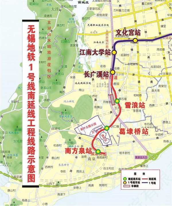 无锡地铁北延的锡澄城际轨道交通工程也即将开工建设。无锡锡澄轨道交通有限公司相关负责人说,锡澄城际轨道交通工程全长30.4公里,设站9座,分别为江阴外滩站、中山公园站、南门站、汽车客运站、江阴高铁站、南闸站、江阴南站、青阳站、徐霞客站,再往南连上无锡地铁1号线堰桥站,前面5座为地下站,后面4座为高架站。待该工程通车后,列车可从长江之畔一路南行开到太湖之滨,无锡将从南至北形成一条全长约65公里的轨道交通线路,无锡南泉直通江阴外滩,一条轨交线挽起太湖和长江,实现“轨道上的通江达湖”。
