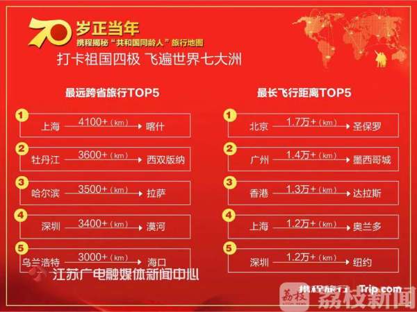 据统计,“共和国同龄人”最远跨省旅行Top5分别为上海-喀什、牡丹江-西双版纳、哈尔滨-拉萨、深圳-漠河、乌兰浩特-海口。