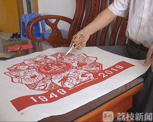 今年76岁的石建松从20岁起自学剪纸,剪纸技艺精湛。每到国庆大庆,他都会创作一幅作品,庆祝新中国成立。石建松告诉记者,“我第一次创作有关庆祝国庆题材的剪纸是在1975年,刚创作的时候比较简单,是散漫式的构图,现在我能把许多元素融合到一张剪纸上面,构图创作比以前的要好得多,丰富得多。”