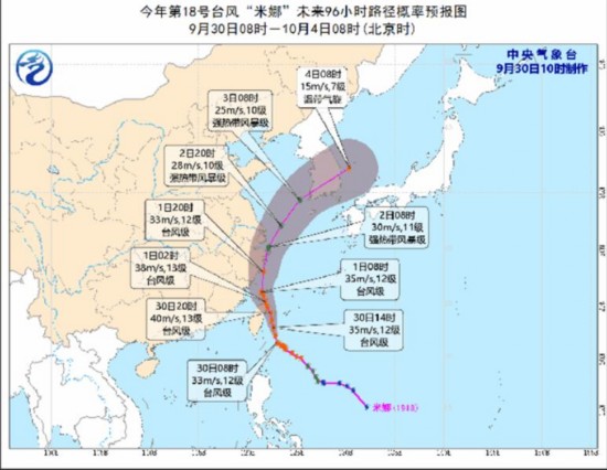 今年第18号台风“米娜”于28日上午8时在菲律宾以东的西北太平洋洋面上生成。目前,其中心位于台湾岛以东洋面,中心附近最大风力12级,正逐渐向浙江中北部沿海靠近,强度继续加强,预计于10月1日下午到夜间登陆或擦过浙江中北部沿海。台风中心经过的附近海域风力11——14级,阵风15——16级。台风将给浙江东部、福建东北部等地带来大到暴雨。根据气象部门分析,“米娜”的路径还可能西调,防御形势不容乐观。