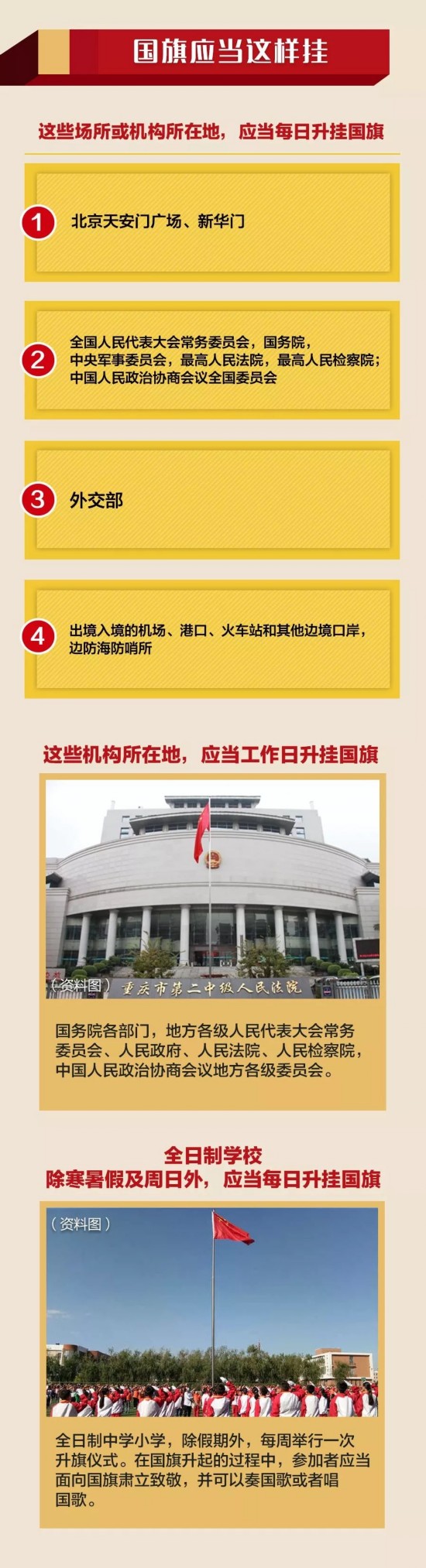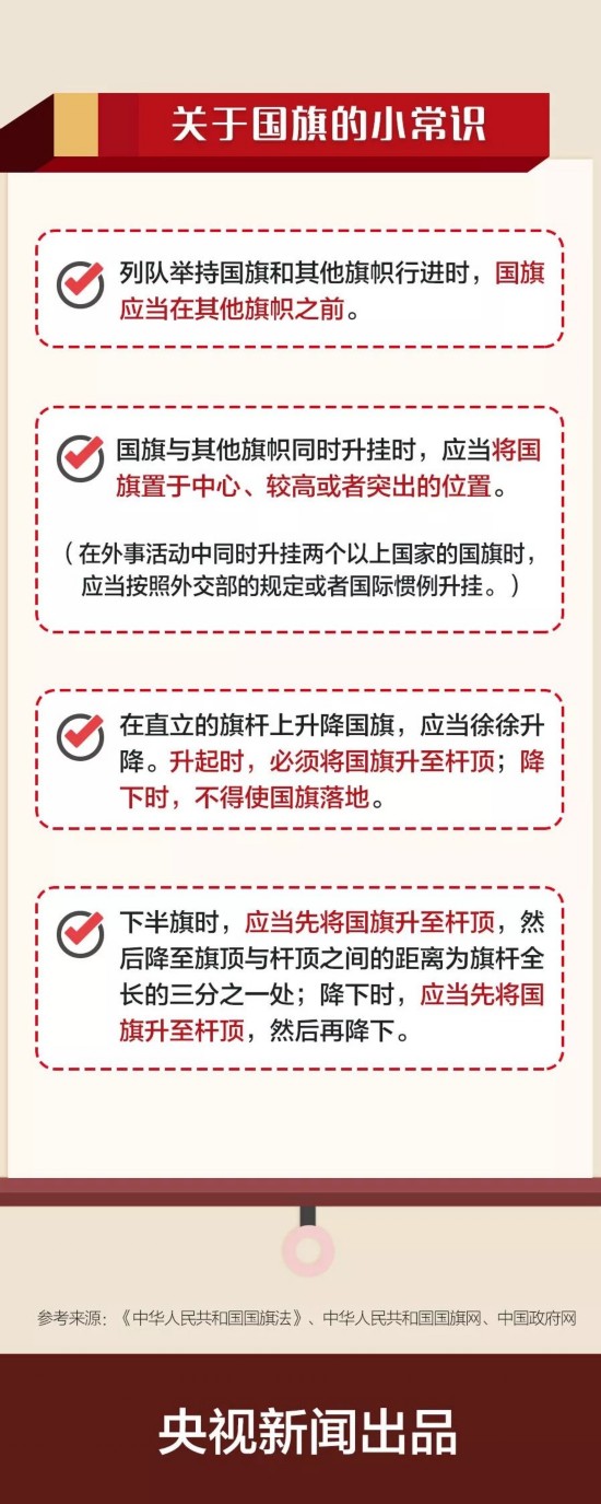 虽说挂国旗是热爱祖国的表现,但如果悬挂方式不妥,就可能违反《中华人民共和国国旗法》。五星红旗,是中华人民共和国的象征和标志,必须规范与正确使用。今天,通过一张图,学习挂国旗的各种小知识↓↓