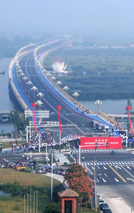 长安北路于2017年7月开工建设,全长5.7km,按一级公路标准设计,设计速度60km/h,路面总宽29.5m,公路边沟外侧设置50m的景观绿化带。全线共设桥梁8座,其中乌巾荡特大桥1座,全长1.8km,集“生态大道”、“文化大道”、“旅游大道”为一体,它的建成将拉近千垛菜花、平旺湖、水上森林等西北部景区与城区距离,缓解景区周边的交通压力,打开直通兴化主城的“北大门”,将千垛菜花搬进了兴化城。