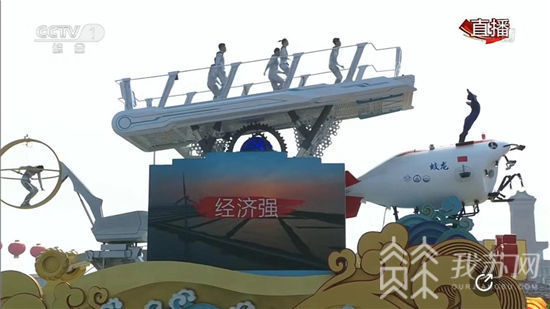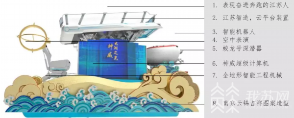 花车顶部,6个奔跑着的人,代表着江苏人民不断奋进、百折不挠、奋力创新的精神意象。花车尾部,展示了徐工研发的国内首个变形机械模型,习近平总书记视察时曾亲切的称之为“小螳螂”。同时,蛟龙号深潜器、神威太湖之光计算机模型也悉数展出,再现了江苏国内领先的科技实力和发达的制造业。花车底部,更有精美的水波纹设计,彰显江苏江河湖海俱全、水乡水韵的区域特征。
