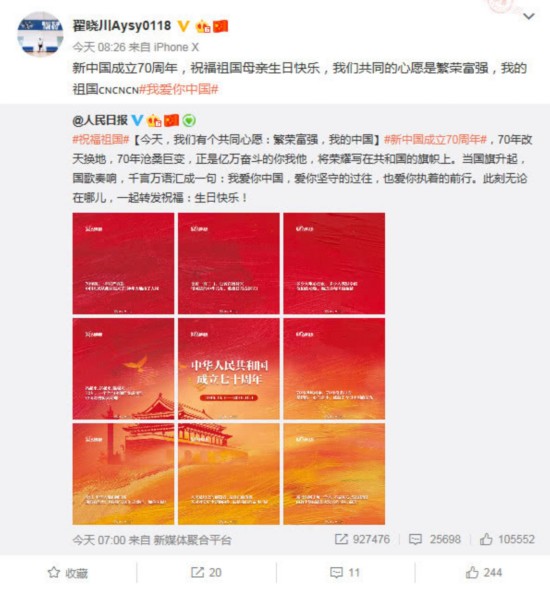 北京男篮前锋翟晓川说:“新中国成立70周年,祝福祖国母亲生日快乐,我们共同的心愿是繁荣富强,我的祖国#我爱你中国#”
