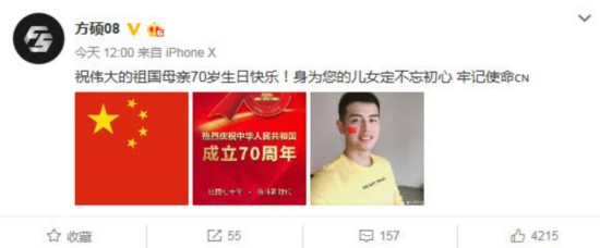 北京男篮后卫方硕说:“祝伟大的祖国母亲70岁生日快乐!身为您的儿女定不忘初心、牢记使命。”