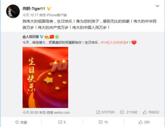 广东男篮前锋周鹏祝福祖国:“我伟大的祖国母亲,生日快乐!身为您的孩子,感到无比的自豪!伟大的中华民族万岁!伟大的共产党万岁!伟大的中国人民万岁!”