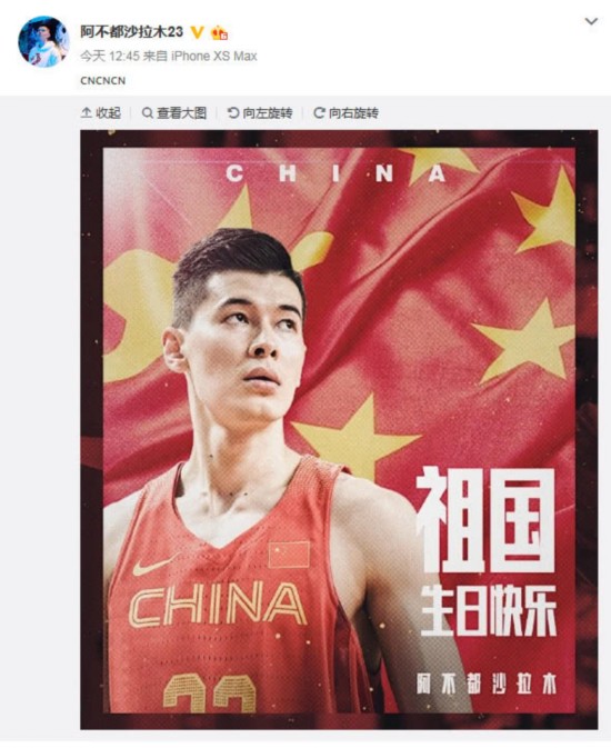 新疆男篮前锋阿不都沙拉木则晒出“祖国生日快乐”的照片,祝福祖国生日快乐。